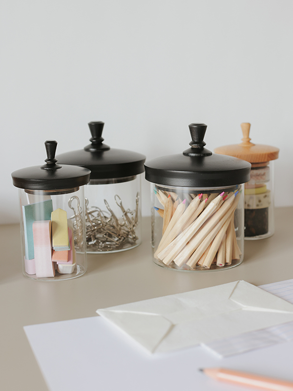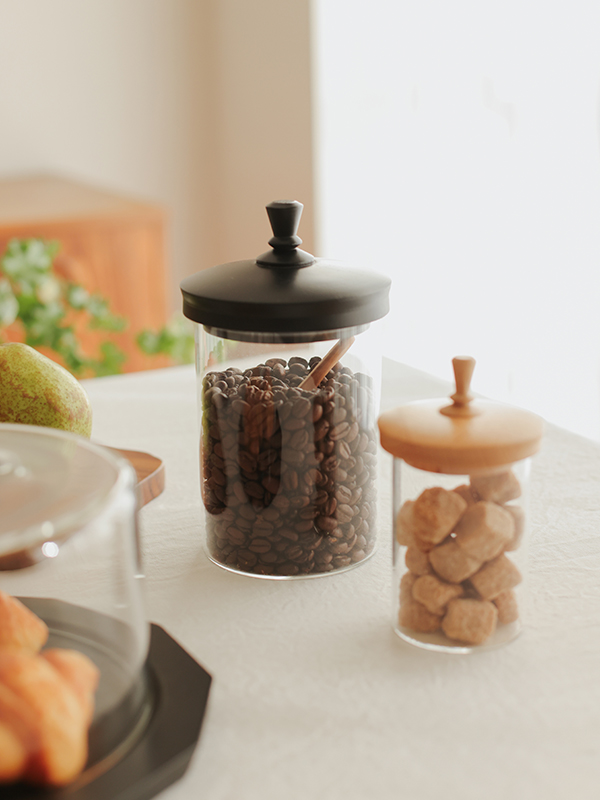 雑多に見えがちな食材や調味料などを整える木蓋付きのガラスジャーです。
