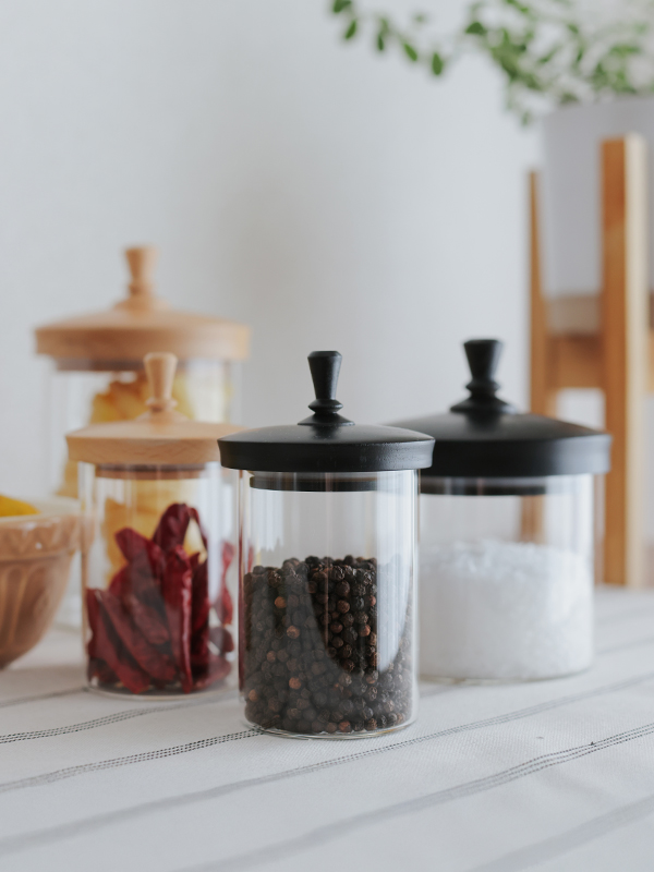 雑多に見えがちな食材や調味料などを整える木蓋付きのガラスジャーです。