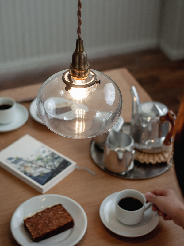 ガラス素材のシェードは光を通すので、点灯すると空間全体に明かりが広がります。昼間消灯している時も自然光を反射し、まるでオブジェのような存在感があります。