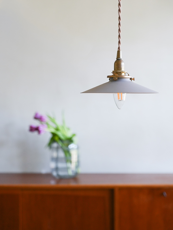 「アイアンシェード プラット グレー」はさらりとした質感のアイアン製。外側は現代的なミディアムグレー、内側はホワイトで電球の光を拡散します。シンプル・モダン・北欧系など、さまざまなインテリアに馴染みます。
