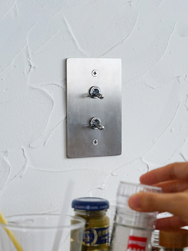 ミニマルな質感のトグルスイッチです。プレート部分はヘアライン加工を施したステンレス製で、経年変化が少なく、耐久性にも優れています。無機質な光沢がシンプルかつ洗練された印象を与えます。