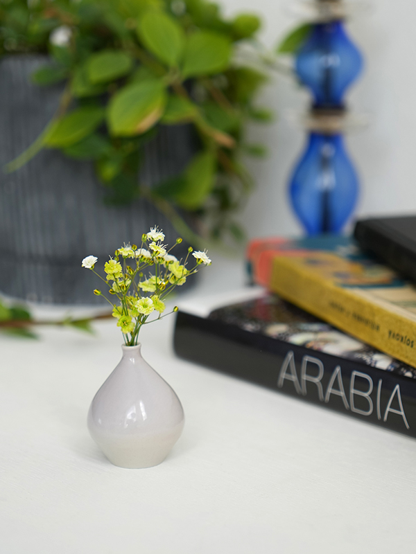 片手に収まるほど小さい、プチサイズのフラワーベースです。「セラミックベース プチクレイン パープル 」は、ニュアンスのあるつややかな薄紫色。ころんと丸みのあるフォルムが可愛らしさをより増します。セラミック(磁器)製なのでしっかりとした強度も感じさせ、品のある佇まいをしています。