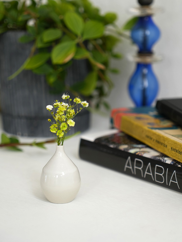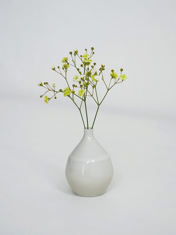 片手に収まるほど小さい、プチサイズのフラワーベースです。「セラミックベース プチクレイン ホワイト」は、つややかなスノーホワイト。釉薬の掛かり具合によって微妙なニュアンスのゆらぎがある質感です。セラミック(磁器)製なのでしっかりとした強度も感じさせ、品のある佇まいをしています。