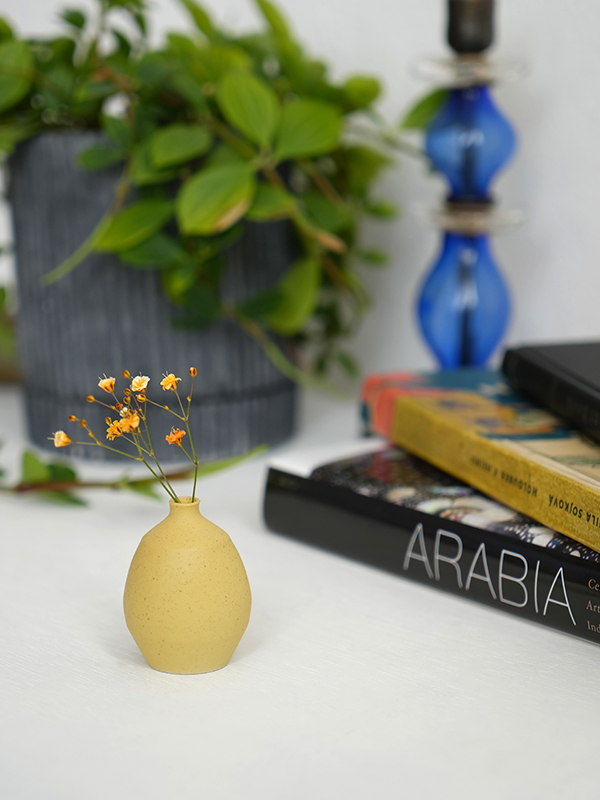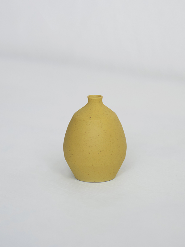 片手に収まるほど小さい、プチサイズのフラワーベースです。「セラミックベース プチクレイン イエロー」は、ざらりとした質感のマスタードイエロー。少しだけエッジのあるフォルムが個性的な表情を見せます。小さいながらセラミック(磁器)製なので、しっかりとした強度も感じさせます。