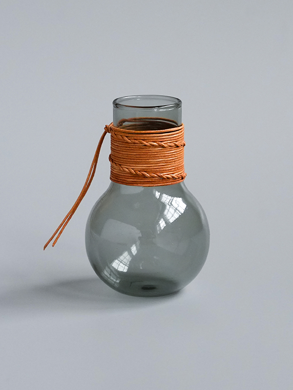 革紐とガラスの組み合わせが可愛い、小さなガラスベースです。