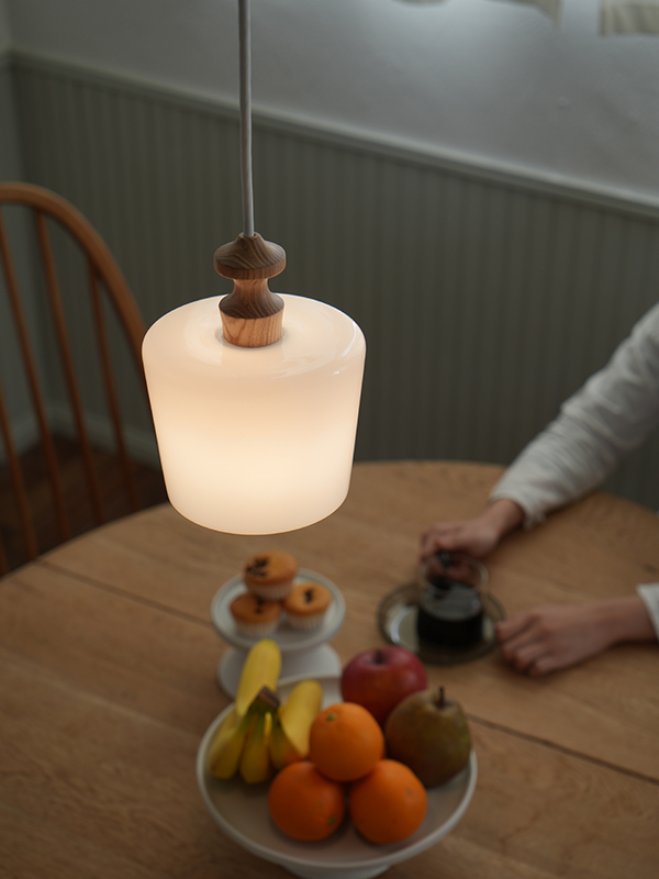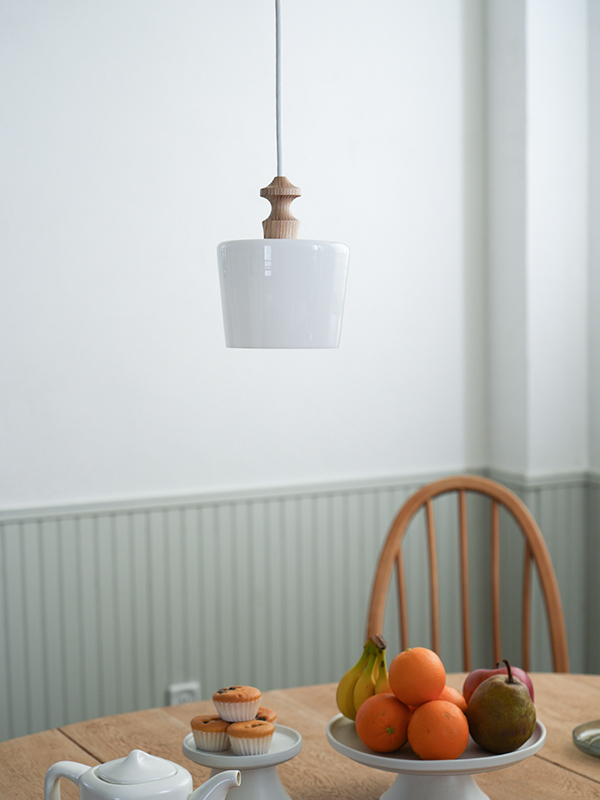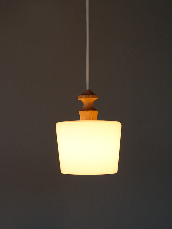 乳白色のガラスシェードと、木製灯具を組み合わせたペンダントライト。
