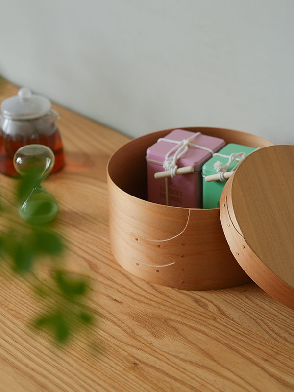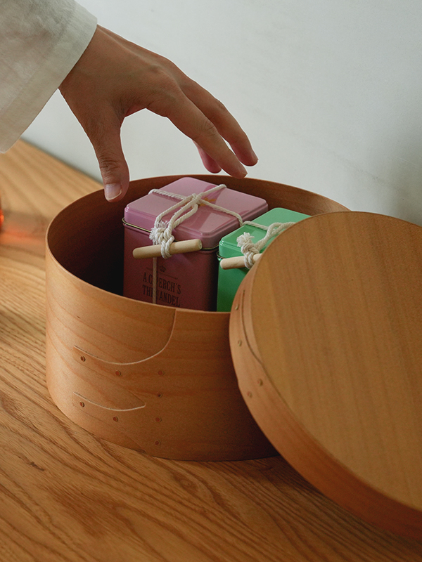 シェーカーの道具にヒントを得て作った正円型のラウンドボックスに、