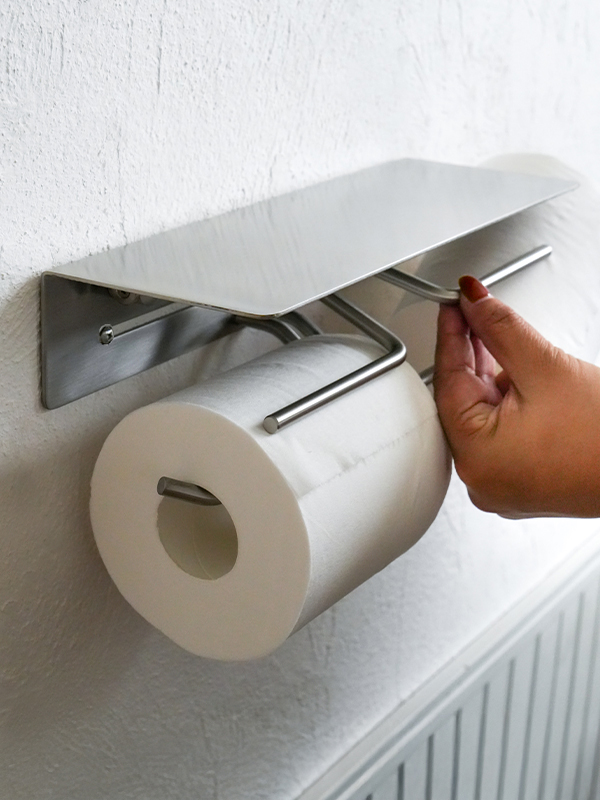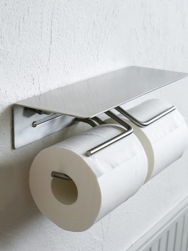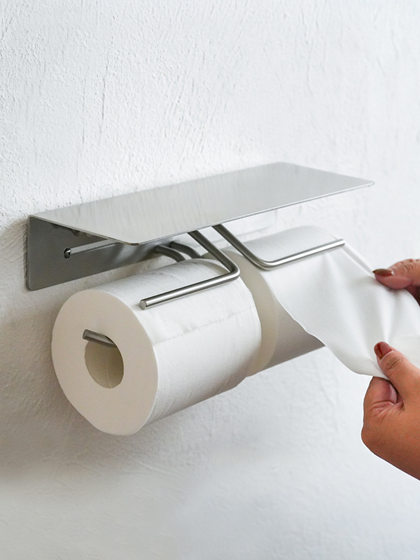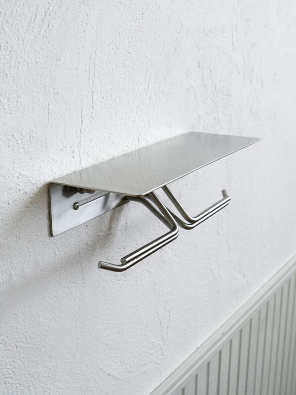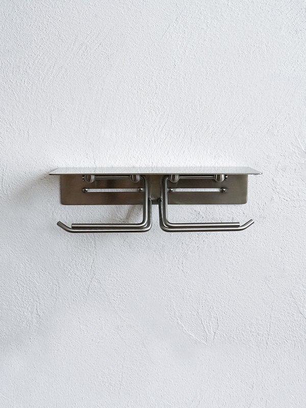 「put ペーパーホルダー ダブル ステンレス」はサテン加工のステンレス製で、ミニマムな存在感。ダブルタイプなのでペーパー2個をセットする事ができます。
