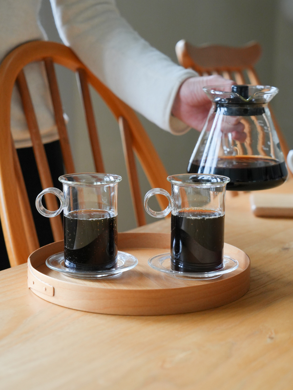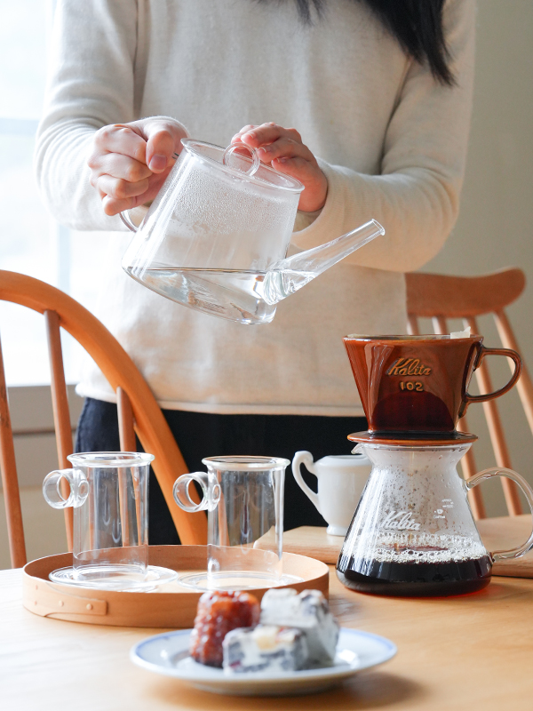 光が透ける様子が美しく、飲み物の色をそのままに楽しめる無色透明のガラス製ティーセットシリーズです。