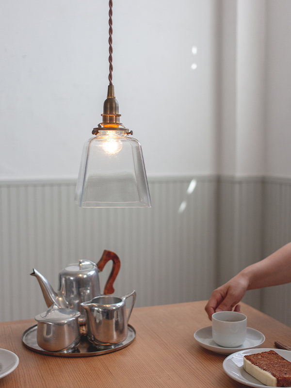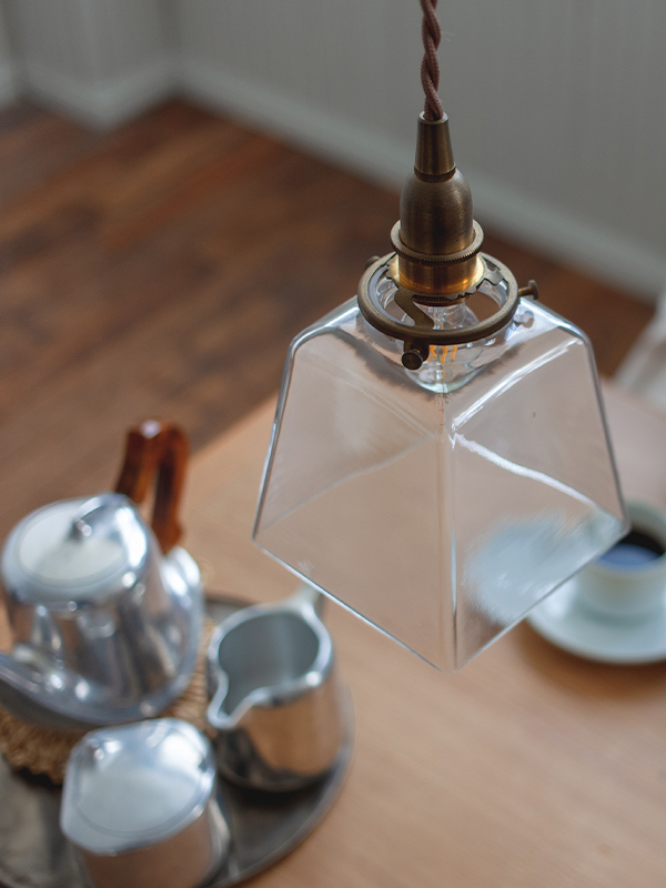 ガラス素材のシェードは光を通すので、点灯すると空間全体に明かりが広がります。昼間消灯している時も自然光を反射し、まるでオブジェのような存在感があります。