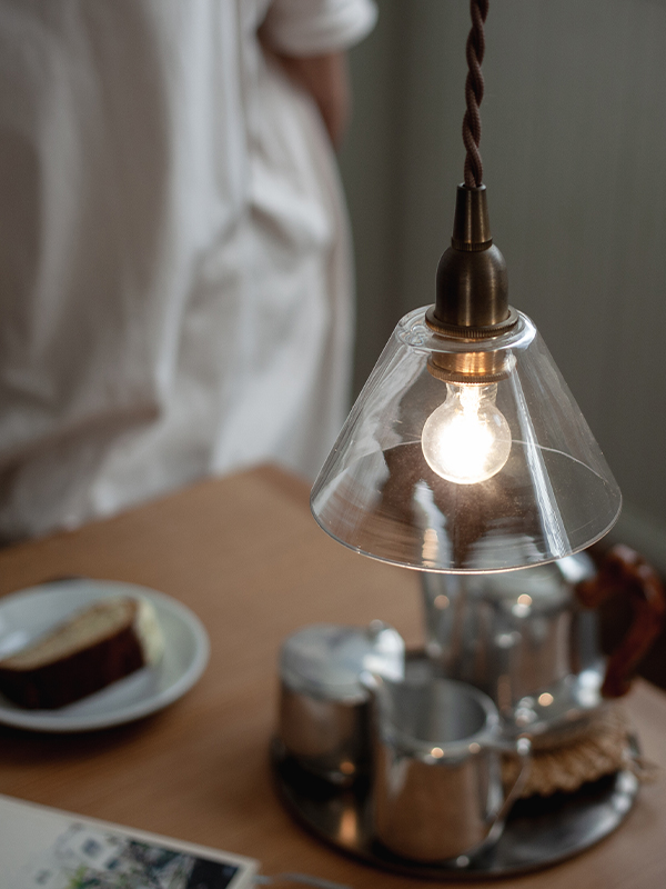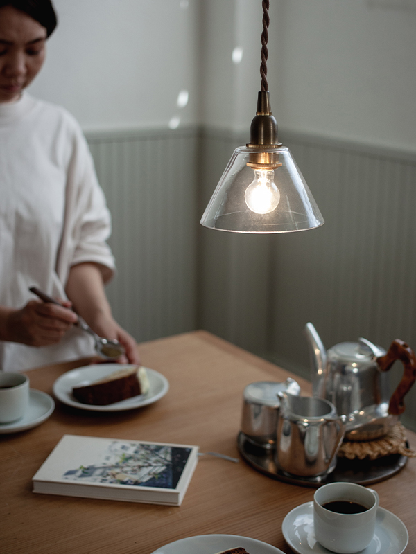 ガラス素材のシェードは光を通すので、点灯すると空間全体に明かりが広がります。昼間消灯している時も自然光を反射し、まるでオブジェのような存在感があります。