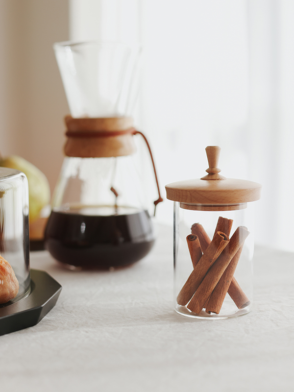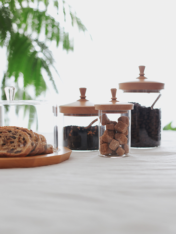 雑多に見えがちな食材や調味料などを整える木蓋付きのガラスジャーです。