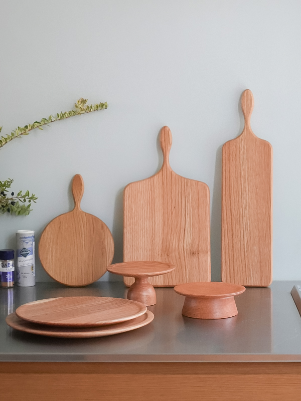 天然のレッドオーク材(やや赤みのあるオーク材)を使用し、食品に使用できるクリア塗装を施しました。